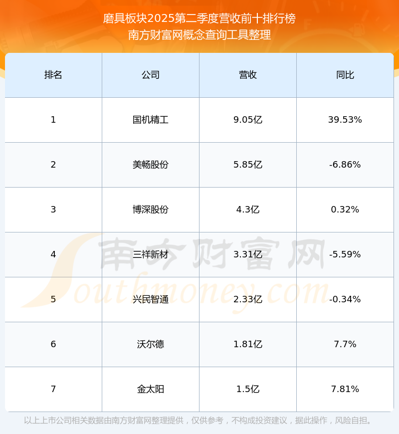 按照南方財富網(wǎng)概念查詢工具統(tǒng)計,該股所屬板塊為磨具板塊,該板塊共有7只股票,魯信創(chuàng)投2025第二季度營收在該板塊中排名為第7名,該板塊2025第二季度營收排名前十的股票如下表: