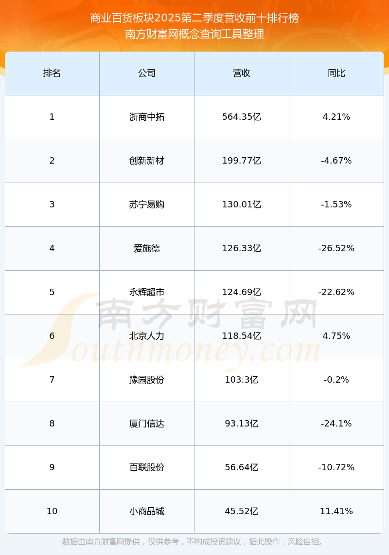 按照南方財富網(wǎng)概念查詢工具統(tǒng)計,該股所屬板塊為商業(yè)百貨板塊,該板塊共有75只股票,茂業(yè)商業(yè)2025第二季度營收在該板塊中排名為第39名,該板塊2025第二季度營收排名前十的股票如下表: