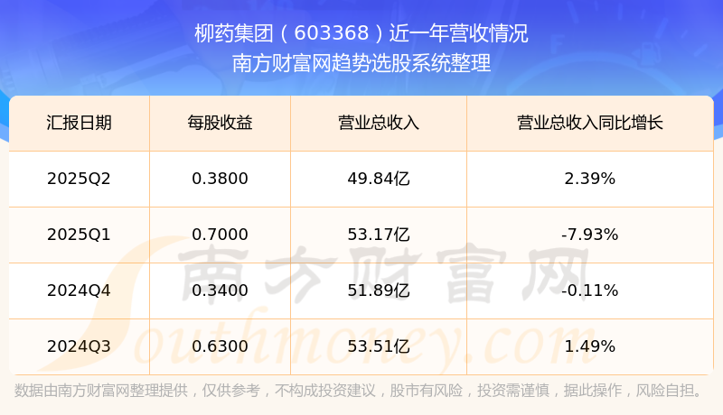 柳藥集團(603368)發(fā)布2025年第二季度財報。2025年第二季度柳藥集團實現(xiàn)營業(yè)收入49.84億元,同比增加2.39元%,環(huán)比增加-6.27%;凈利潤為1.52億元,同比增長-7.26%,環(huán)比增長-45.21%。