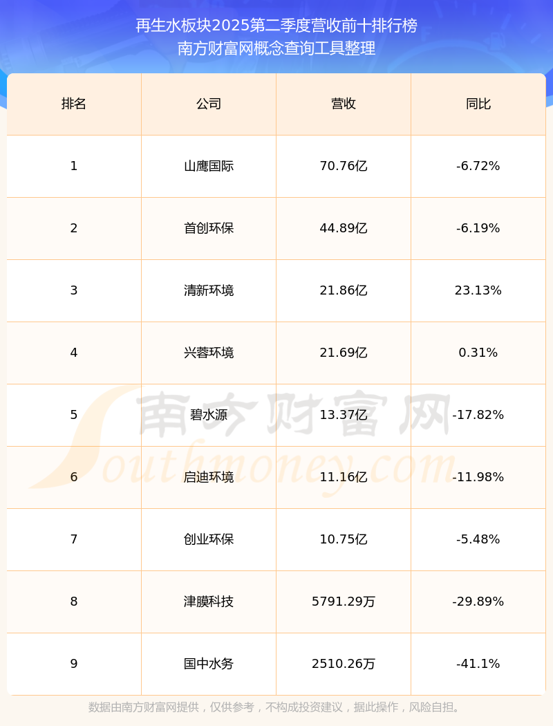 按照南方財(cái)富網(wǎng)概念查詢工具統(tǒng)計(jì),該股所屬板塊為再生水板塊,該板塊共有9只股票,創(chuàng)業(yè)環(huán)保2025第二季度營收在該板塊中排名為第7名,該板塊2025第二季度營收排名前十的股票如下表: