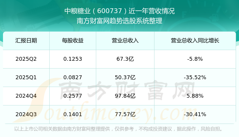 中糧糖業(yè)(600737)發(fā)布2025年第二季度財報。2025年第二季度中糧糖業(yè)實現(xiàn)營業(yè)收入67.3億元,同比增加-5.8元%,環(huán)比增加33.61%;凈利潤為2.68億元,同比增長-36.54%,環(huán)比增長51.38%。