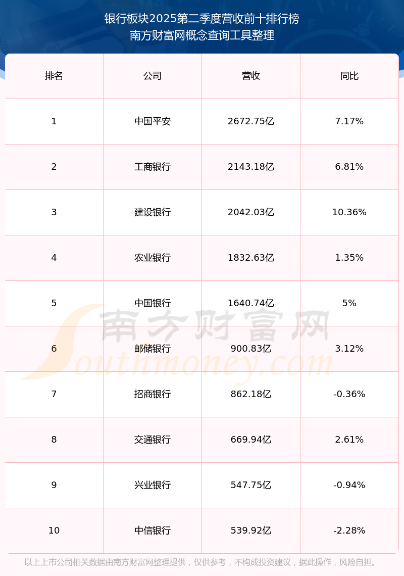 按照南方財富網(wǎng)概念查詢工具統(tǒng)計,該股所屬板塊為銀行板塊,該板塊共有44只股票,光大銀行2025第二季度營收在該板塊中排名為第14名,該板塊2025第二季度營收排名前十的股票如下表: