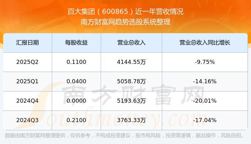 百大集團(tuán)2025年第二季度顯示,公司主營收入4144.55萬元,同比-9.75%;歸母凈利潤4104.72萬元,同比156.65%;扣非凈利潤1366.43萬元,同比-24.98%。