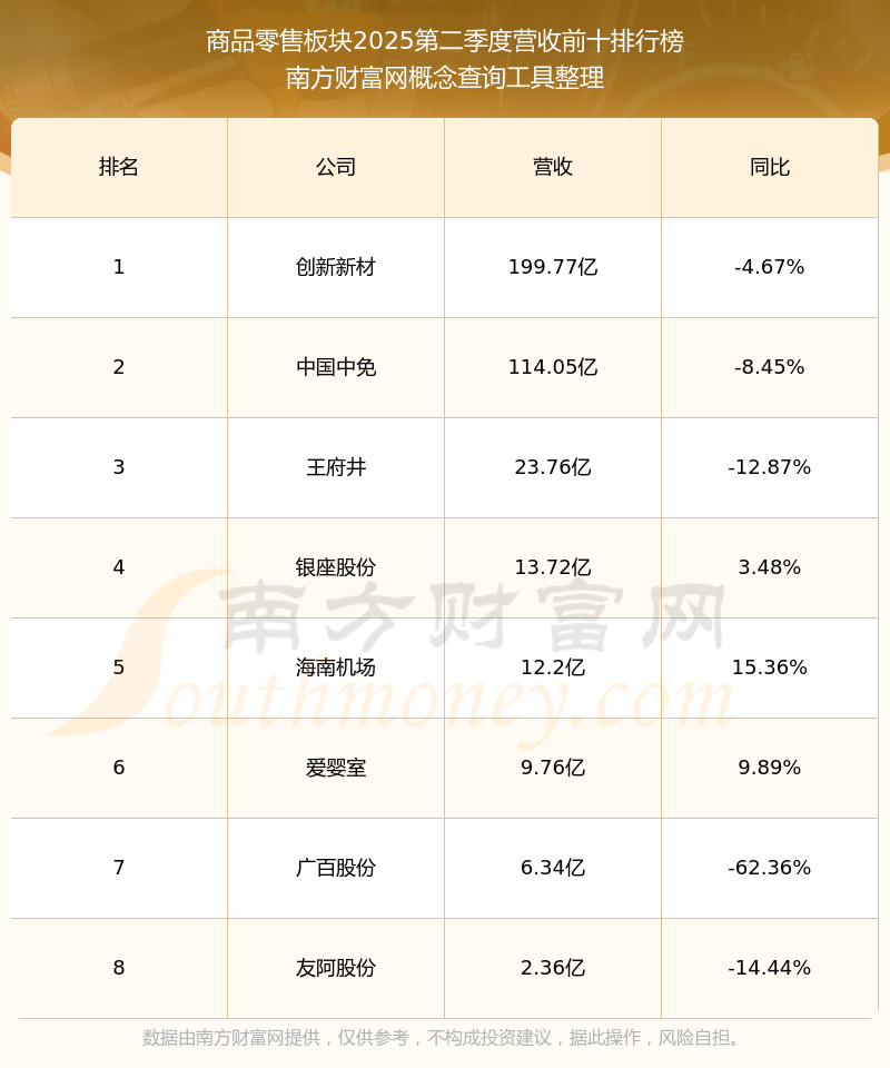 按照南方財富網(wǎng)概念查詢工具統(tǒng)計,該股所屬板塊為商品零售板塊,該板塊共有8只股票,百大集團(tuán)2025第二季度營收在該板塊中排名為第8名,該板塊2025第二季度營收排名前十的股票如下表: