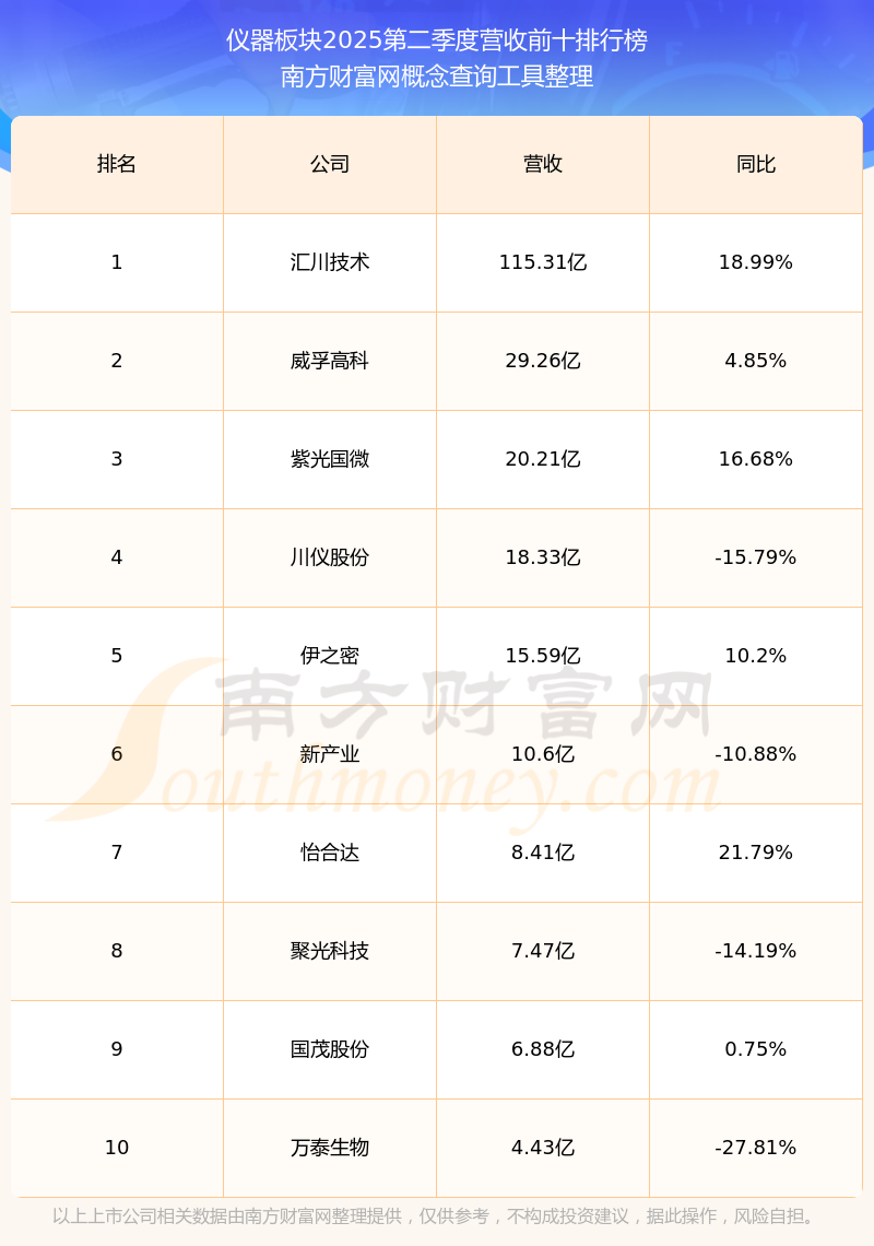 按照南方財(cái)富網(wǎng)概念查詢工具統(tǒng)計(jì),該股所屬板塊為儀器板塊,該板塊共有24只股票,坤恒順維2025第二季度營(yíng)收在該板塊中排名為第24名,該板塊2025第二季度營(yíng)收排名前十的股票如下表: