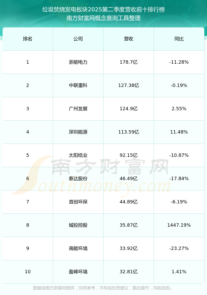 按照南方財富網(wǎng)概念查詢工具統(tǒng)計,該股所屬板塊為垃圾焚燒發(fā)電板塊,該板塊共有52只股票,偉明環(huán)保2025第二季度營收在該板塊中排名為第16名,該板塊2025第二季度營收排名前十的股票如下表: