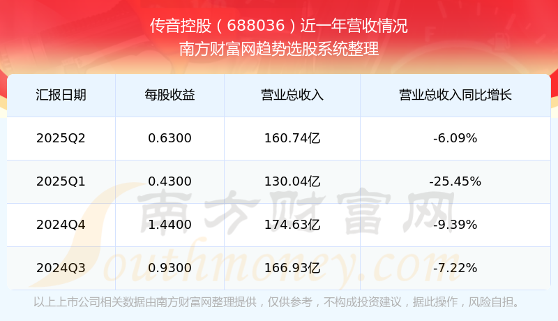 于2025年第二季度,傳音控股披露了其業(yè)績表現(xiàn),其中主營業(yè)務(wù)收入160.74億元,相較于去年同期-6.09%。此外,公司歸屬于母公司的凈利潤為7.23億元,同比增長了-41.03%。在扣除所有非經(jīng)常性損益后,凈利潤5.54億元,同比增長-48.42%。
