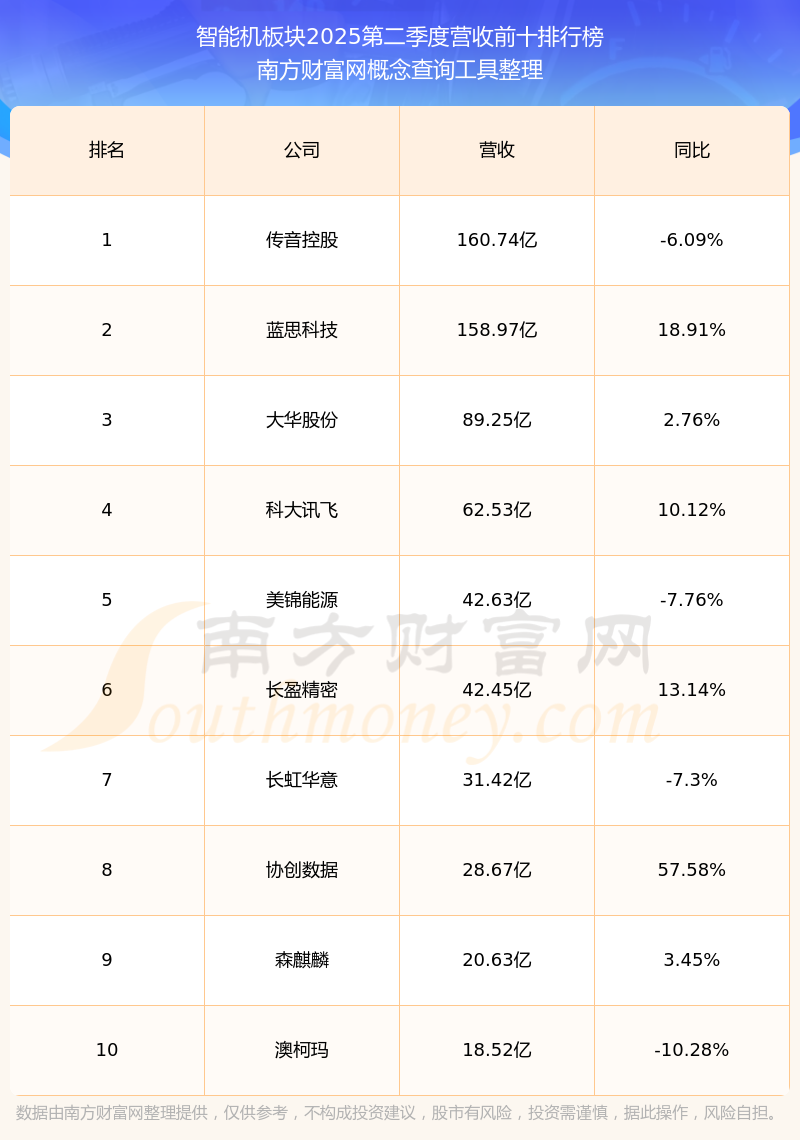 按照南方財(cái)富網(wǎng)概念查詢工具統(tǒng)計(jì),該股所屬板塊為智能機(jī)板塊,該板塊共有42只股票,傳音控股2025第二季度營收在該板塊中排名為第1名,該板塊2025第二季度營收排名前十的股票如下表: