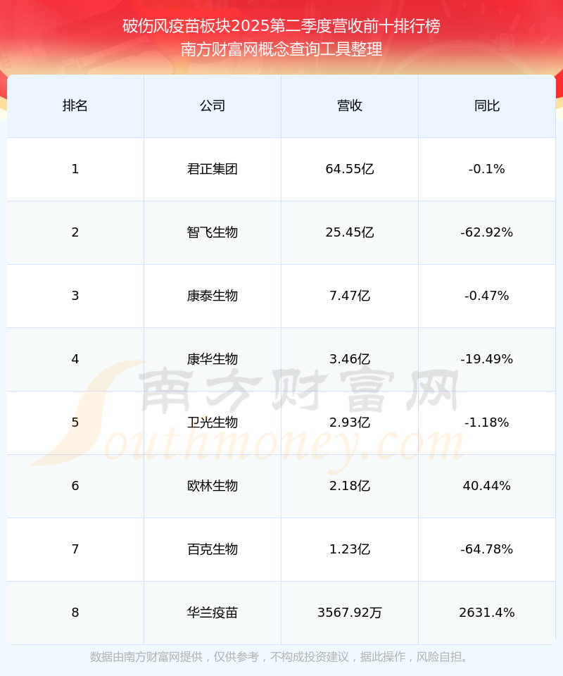 按照南方財富網(wǎng)概念查詢工具統(tǒng)計,該股所屬板塊為破傷風疫苗板塊,該板塊共有8只股票,歐林生物2025第二季度營收在該板塊中排名為第6名,該板塊2025第二季度營收排名前十的股票如下表: