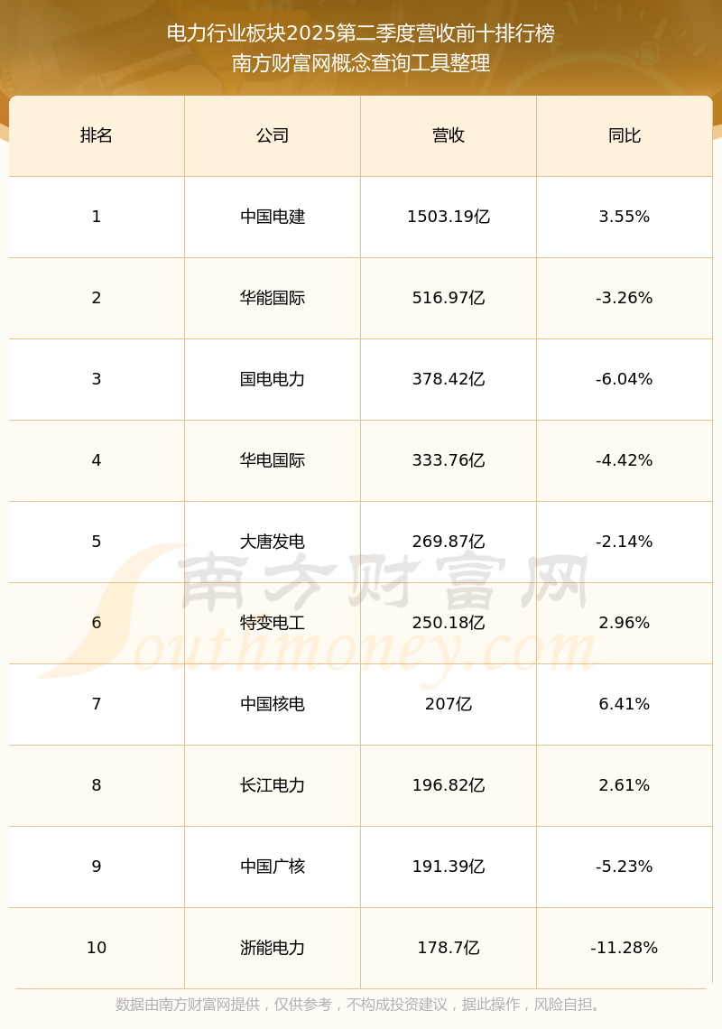 按照南方財富網(wǎng)概念查詢工具統(tǒng)計,該股所屬板塊為電力行業(yè)板塊,該板塊共有93只股票,江蘇新能2025第二季度營收在該板塊中排名為第71名,該板塊2025第二季度營收排名前十的股票如下表: