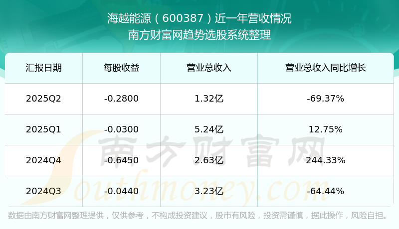 海越能源2025年第二季度顯示,公司主營收入1.32億元,同比-69.37%;歸母凈利潤-1.29億元,同比-1086.16%;扣非凈利潤-3811.74萬元,同比-336.86%;