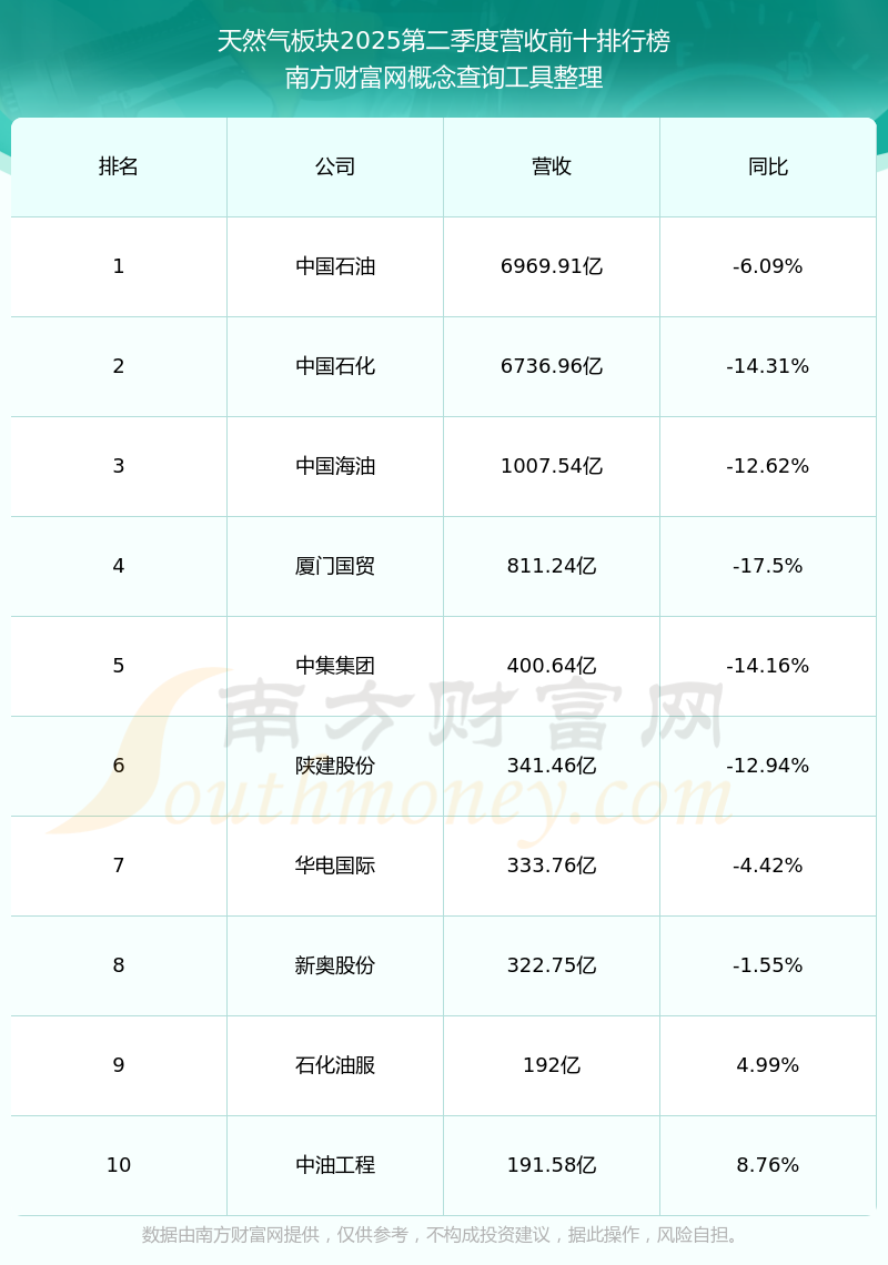 按照南方財(cái)富網(wǎng)概念查詢工具統(tǒng)計(jì),該股所屬板塊為天然氣板塊,該板塊共有154只股票,東方環(huán)宇2025第二季度營(yíng)收在該板塊中排名為第128名,該板塊2025第二季度營(yíng)收排名前十的股票如下表: