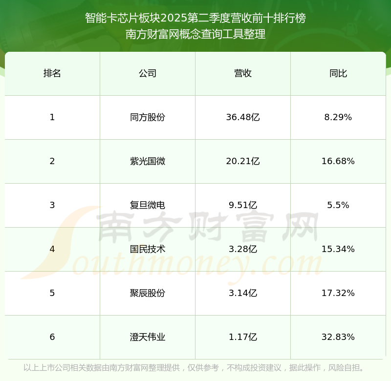 按照南方財富網(wǎng)概念查詢工具統(tǒng)計,該股所屬板塊為智能卡芯片板塊,該板塊共有6只股票,聚辰股份2025第二季度營收在該板塊中排名為第5名,該板塊2025第二季度營收排名前十的股票如下表:
