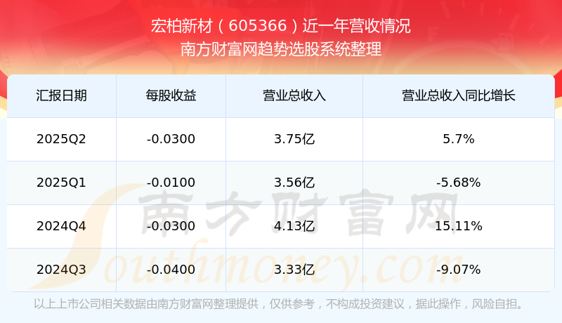 宏柏新材(605366)發(fā)布2025年第二季度財報。2025年第二季度宏柏新材實現(xiàn)營業(yè)收入3.75億元,同比增加5.7元%,環(huán)比增加5.48%;凈利潤為-2098.63萬元,同比增長-657.17%,環(huán)比增長-273.47%。