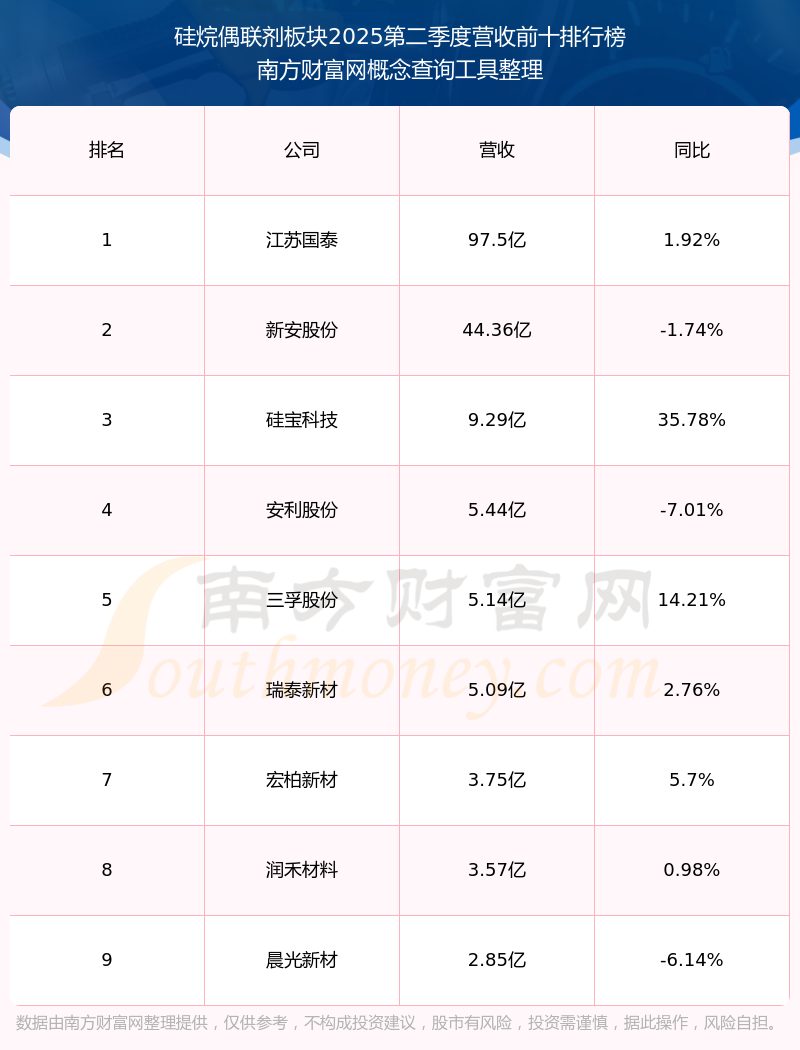 按照南方財富網(wǎng)概念查詢工具統(tǒng)計,該股所屬板塊為硅烷偶聯(lián)劑板塊,該板塊共有9只股票,宏柏新材2025第二季度營收在該板塊中排名為第7名,該板塊2025第二季度營收排名前十的股票如下表: