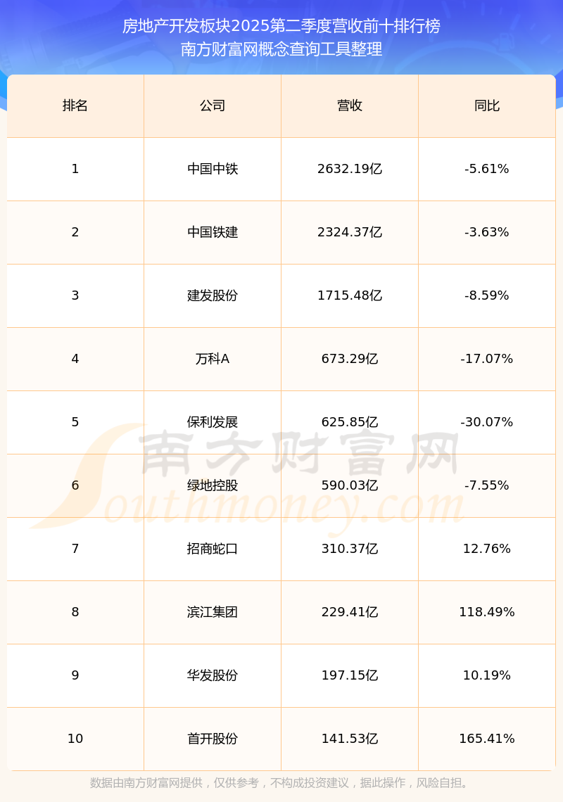 按照南方財(cái)富網(wǎng)概念查詢工具統(tǒng)計(jì),該股所屬板塊為房地產(chǎn)開發(fā)板塊,該板塊共有143只股票,上海臨港2025第二季度營(yíng)收在該板塊中排名為第47名,該板塊2025第二季度營(yíng)收排名前十的股票如下表: