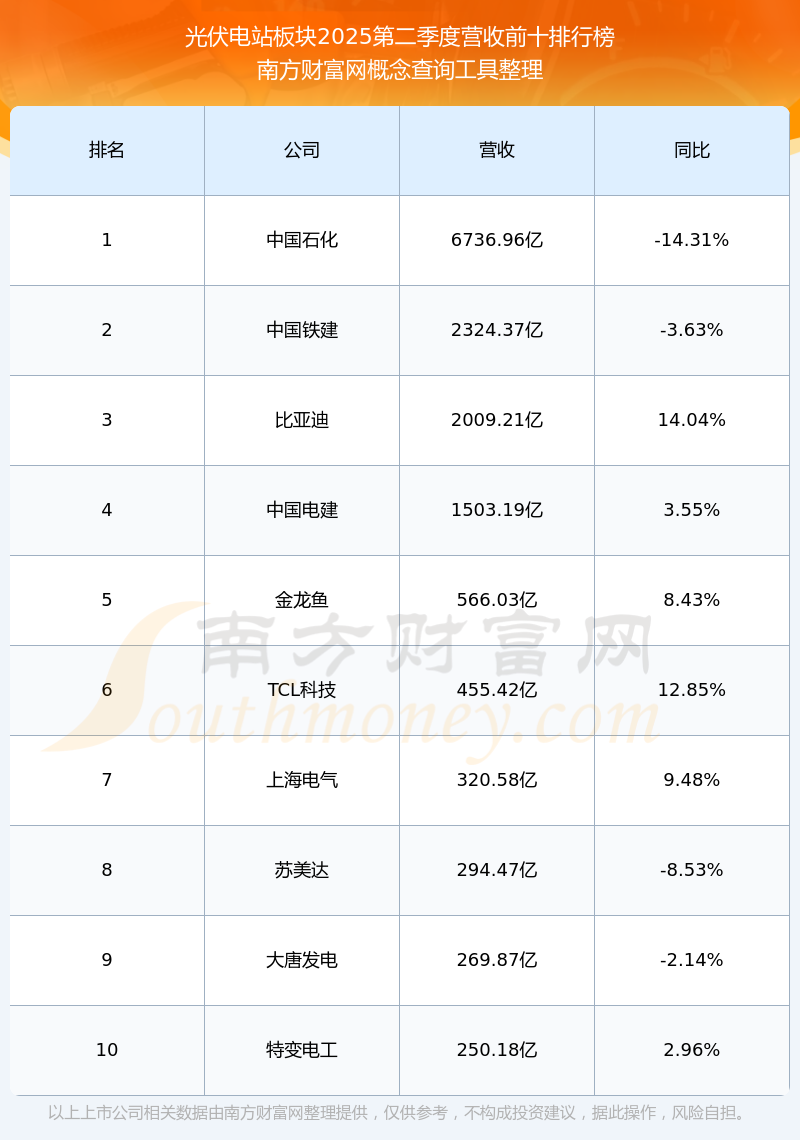 按照南方財(cái)富網(wǎng)概念查詢工具統(tǒng)計(jì),該股所屬板塊為光伏電站板塊,該板塊共有167只股票,清源股份2025第二季度營(yíng)收在該板塊中排名為第95名,該板塊2025第二季度營(yíng)收排名前十的股票如下表: