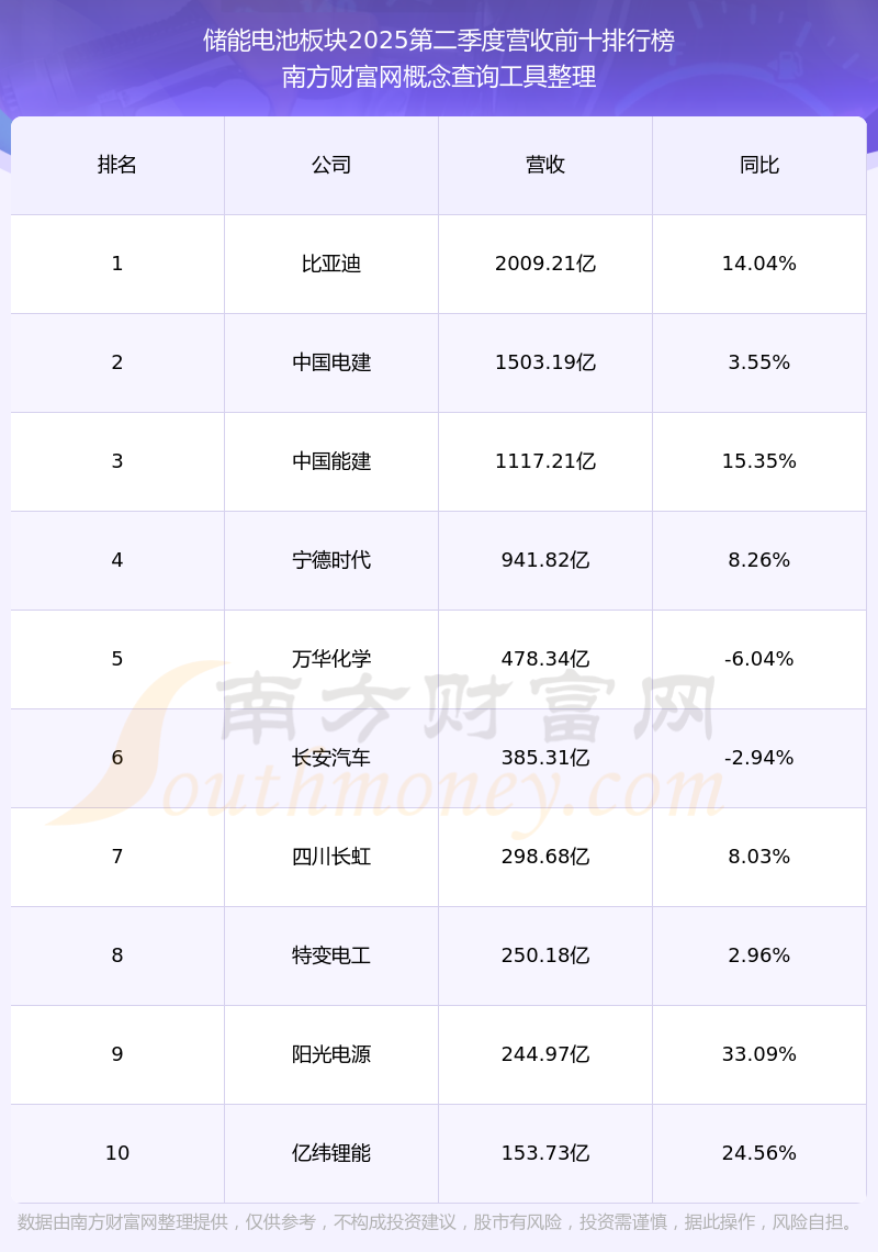 按照南方財(cái)富網(wǎng)概念查詢工具統(tǒng)計(jì),該股所屬板塊為儲(chǔ)能電池板塊,該板塊共有104只股票,艾羅能源2025第二季度營(yíng)收在該板塊中排名為第64名,該板塊2025第二季度營(yíng)收排名前十的股票如下表: