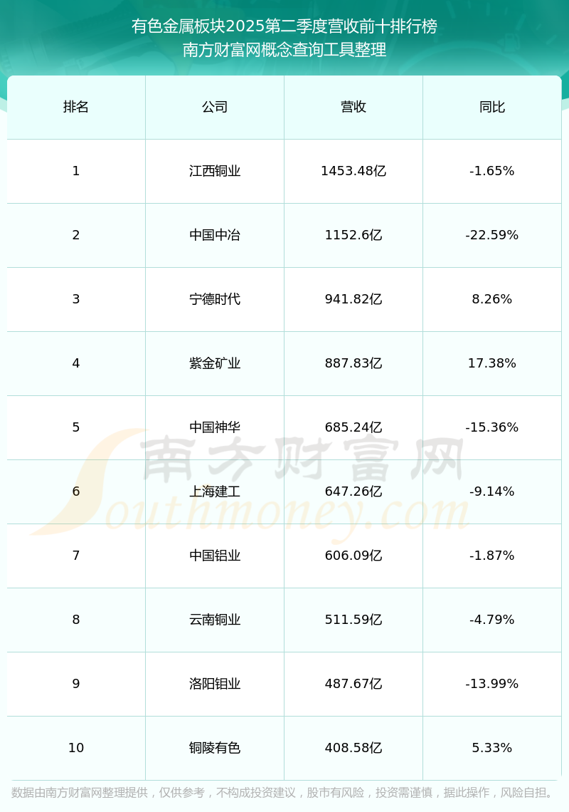 按照南方財富網(wǎng)概念查詢工具統(tǒng)計,該股所屬板塊為有色金屬板塊,該板塊共有289只股票,鼎勝新材2025第二季度營收在該板塊中排名為第58名,該板塊2025第二季度營收排名前十的股票如下表: