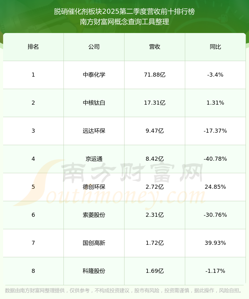 按照南方財(cái)富網(wǎng)概念查詢工具統(tǒng)計(jì),該股所屬板塊為脫硝催化劑板塊,該板塊共有8只股票,德創(chuàng)環(huán)保2025第二季度營收在該板塊中排名為第5名,該板塊2025第二季度營收排名前十的股票如下表: