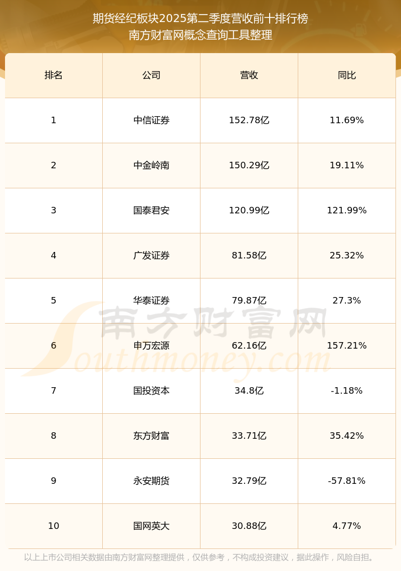 按照南方財富網(wǎng)概念查詢工具統(tǒng)計,該股所屬板塊為期貨經(jīng)紀板塊,該板塊共有25只股票,南華期貨2025第二季度營收在該板塊中排名為第23名,該板塊2025第二季度營收排名前十的股票如下表: