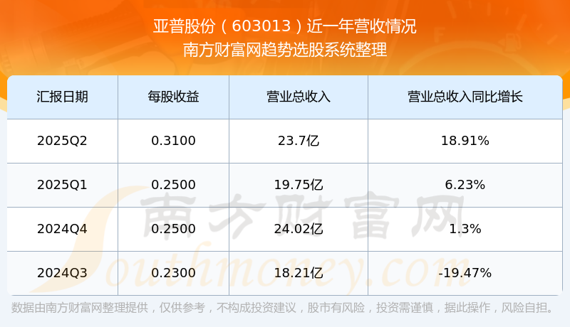 亞普股份2025年第二季度公司實現(xiàn)營業(yè)收入23.7億元,同比18.91%;歸母凈利潤1.58億元,同比22.67%。