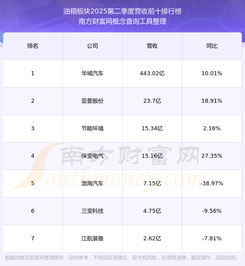 按照南方財富網(wǎng)概念查詢工具統(tǒng)計,該股所屬板塊為油箱板塊,該板塊共有7只股票,亞普股份2025第二季度營收在該板塊中排名為第2名,該板塊2025第二季度營收排名前十的股票如下表: