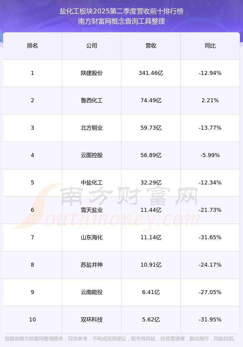 按照南方財富網(wǎng)概念查詢工具統(tǒng)計,該股所屬板塊為鹽化工板塊,該板塊共有11只股票,江鹽集團2025第二季度營收在該板塊中排名為第11名,該板塊2025第二季度營收排名前十的股票如下表:
