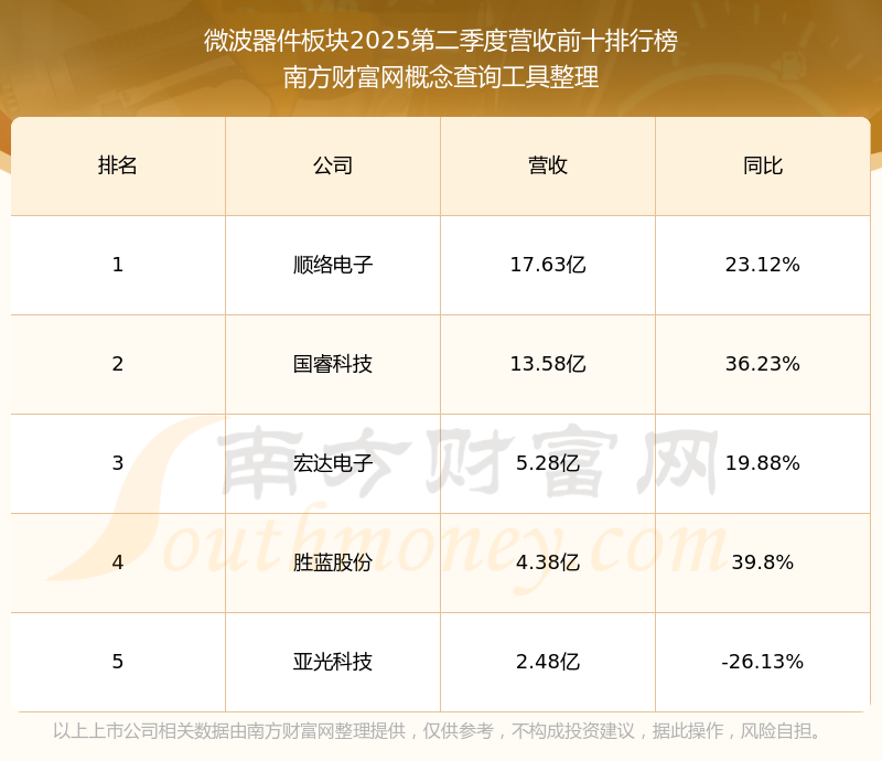 按照南方財(cái)富網(wǎng)概念查詢工具統(tǒng)計(jì),該股所屬板塊為微波器件板塊,該板塊共有5只股票,國(guó)光電氣2025第二季度營(yíng)收在該板塊中排名為第5名,該板塊2025第二季度營(yíng)收排名前十的股票如下表: