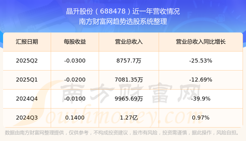 晶升股份2025年第二季度顯示,公司主營收入8757.7萬元,同比-25.53%;歸母凈利潤-491.78萬元,同比-124.36%;扣非凈利潤-1190.28萬元,同比-224.09%;