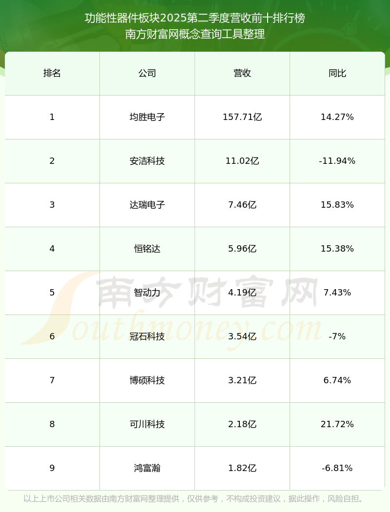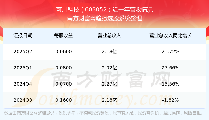 按照南方財(cái)富網(wǎng)概念查詢工具統(tǒng)計(jì),該股所屬板塊為功能性器件板塊,該板塊共有9只股票,可川科技2025第二季度營(yíng)收在該板塊中排名為第8名,該板塊2025第二季度營(yíng)收排名前十的股票如下表: