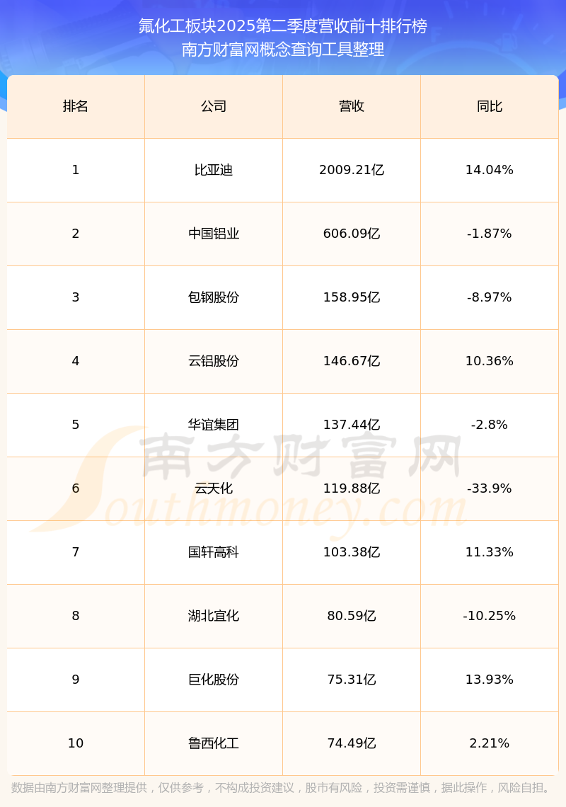 按照南方財(cái)富網(wǎng)概念查詢工具統(tǒng)計(jì),該股所屬板塊為氟化工板塊,該板塊共有46只股票,光電股份2025第二季度營(yíng)收在該板塊中排名為第32名,該板塊2025第二季度營(yíng)收排名前十的股票如下表: