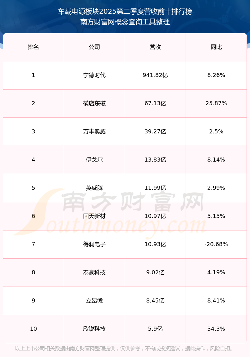 按照南方財富網(wǎng)概念查詢工具統(tǒng)計,該股所屬板塊為車載電源板塊,該板塊共有14只股票,威邁斯2025第二季度營收在該板塊中排名為第14名,該板塊2025第二季度營收排名前十的股票如下表: