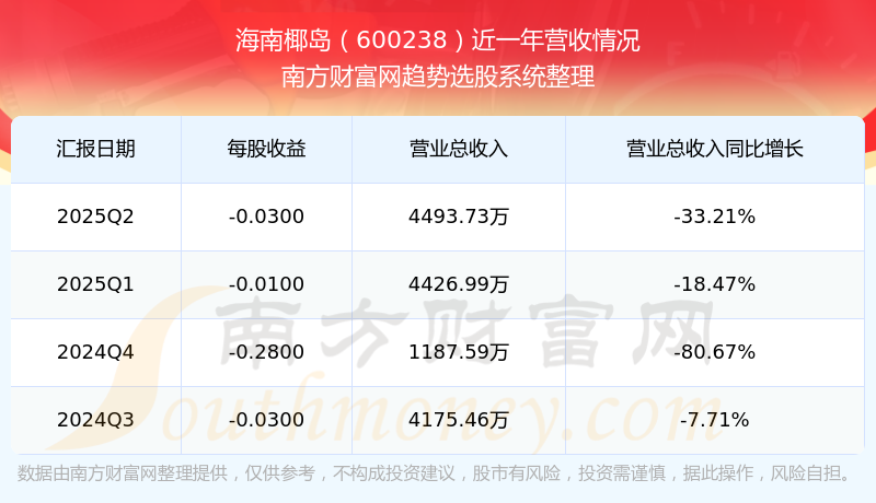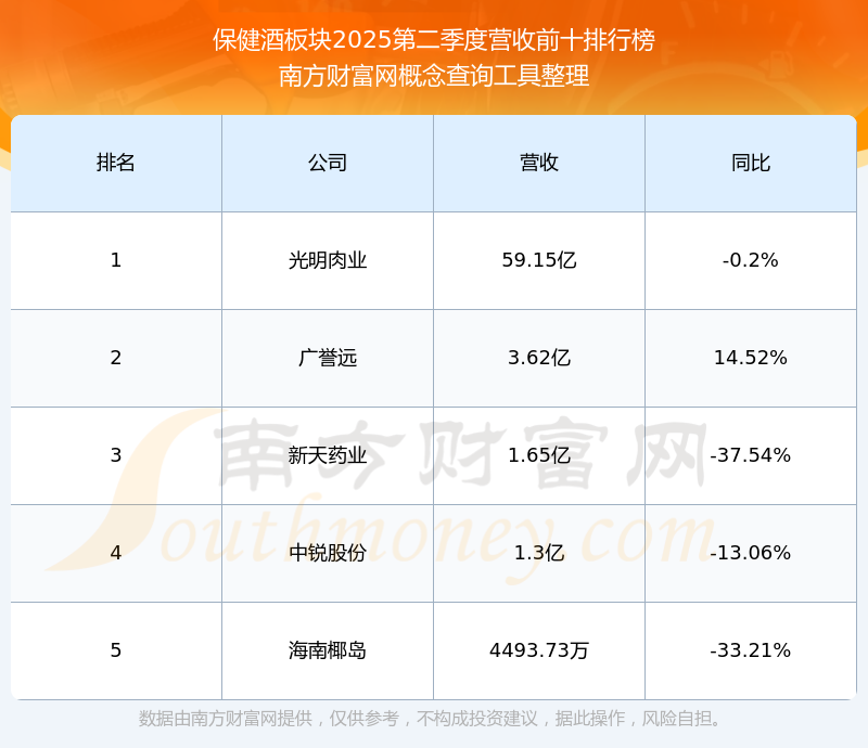 按照南方財(cái)富網(wǎng)概念查詢工具統(tǒng)計(jì),該股所屬板塊為保健酒板塊,該板塊共有5只股票,海南椰島2025第二季度營(yíng)收在該板塊中排名為第5名,該板塊2025第二季度營(yíng)收排名前十的股票如下表: