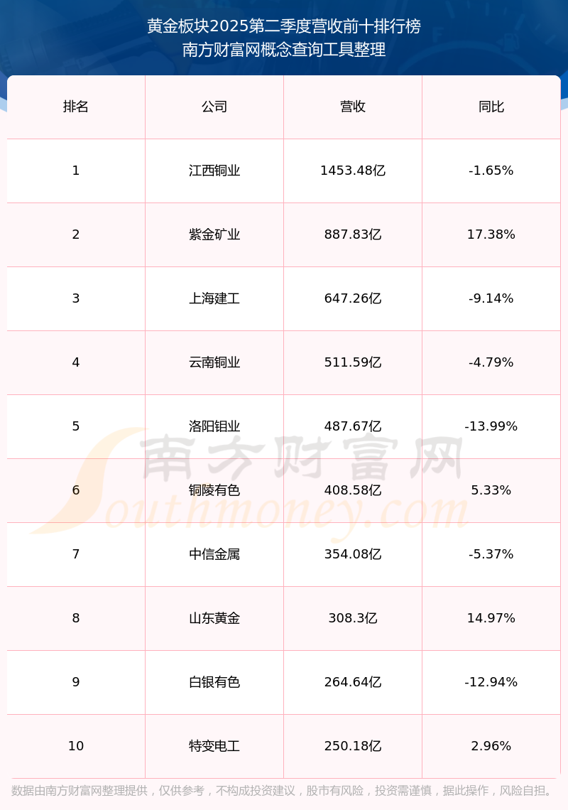 按照南方財(cái)富網(wǎng)概念查詢工具統(tǒng)計(jì),該股所屬板塊為黃金板塊,該板塊共有86只股票,老鳳祥2025第二季度營收在該板塊中排名為第15名,該板塊2025第二季度營收排名前十的股票如下表: