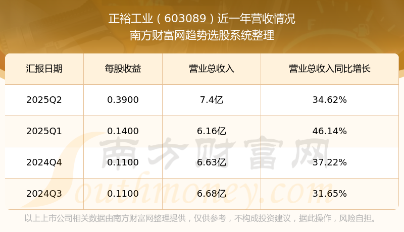 正裕工業(yè)2025年第二季度顯示,公司主營收入7.4億元,同比34.62%;歸母凈利潤8829.55萬元,同比1113.26%;扣非凈利潤4062.33萬元,同比914.64%。