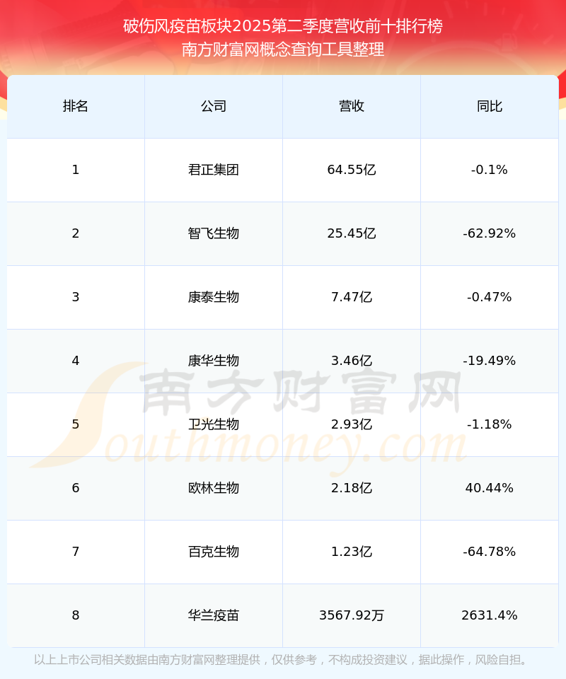按照南方財(cái)富網(wǎng)概念查詢工具統(tǒng)計(jì),該股所屬板塊為破傷風(fēng)疫苗板塊,該板塊共有8只股票,歐林生物2025第二季度營(yíng)收在該板塊中排名為第6名,該板塊2025第二季度營(yíng)收排名前十的股票如下表: