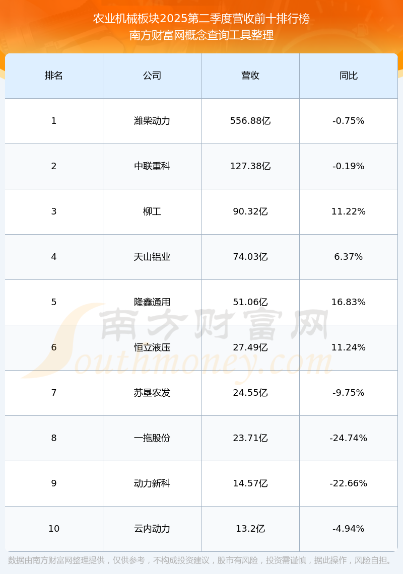 按照南方財富網(wǎng)概念查詢工具統(tǒng)計,該股所屬板塊為農(nóng)業(yè)機械板塊,該板塊共有38只股票,一拖股份2025第二季度營收在該板塊中排名為第8名,該板塊2025第二季度營收排名前十的股票如下表: