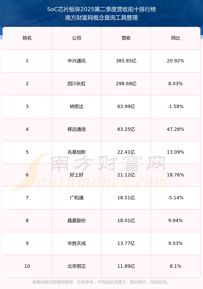 按照南方財(cái)富網(wǎng)概念查詢(xún)工具統(tǒng)計(jì),該股所屬板塊為SoC芯片板塊,該板塊共有52只股票,炬芯科技2025第二季度營(yíng)收在該板塊中排名為第38名,該板塊2025第二季度營(yíng)收排名前十的股票如下表: