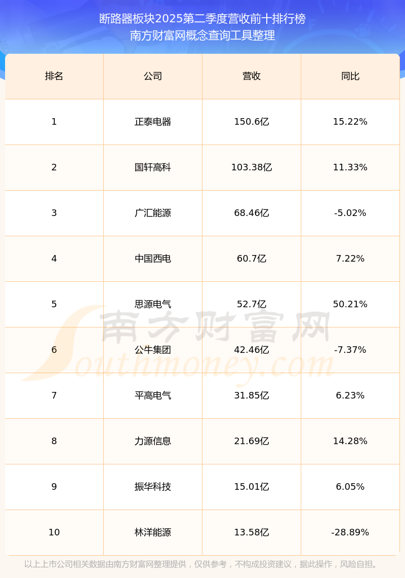 按照南方財(cái)富網(wǎng)概念查詢工具統(tǒng)計(jì),該股所屬板塊為斷路器板塊,該板塊共有30只股票,洛凱股份2025第二季度營(yíng)收在該板塊中排名為第18名,該板塊2025第二季度營(yíng)收排名前十的股票如下表: