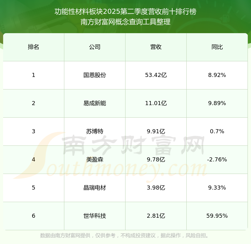 按照南方財(cái)富網(wǎng)概念查詢工具統(tǒng)計(jì),該股所屬板塊為功能性材料板塊,該板塊共有6只股票,世華科技2025第二季度營收在該板塊中排名為第6名,該板塊2025第二季度營收排名前十的股票如下表: