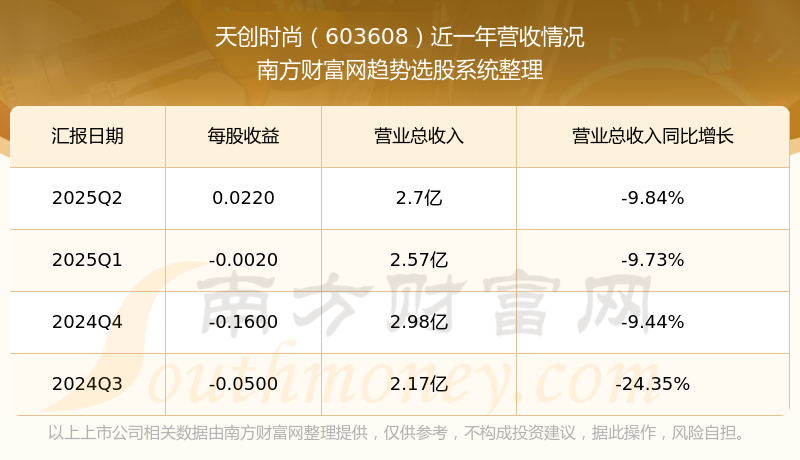 天創(chuàng)時尚2025年第二季度顯示,公司主營收入2.7億元,同比-9.84%;歸母凈利潤768.25萬元,同比259.71%;扣非凈利潤599.61萬元,同比190.5%。