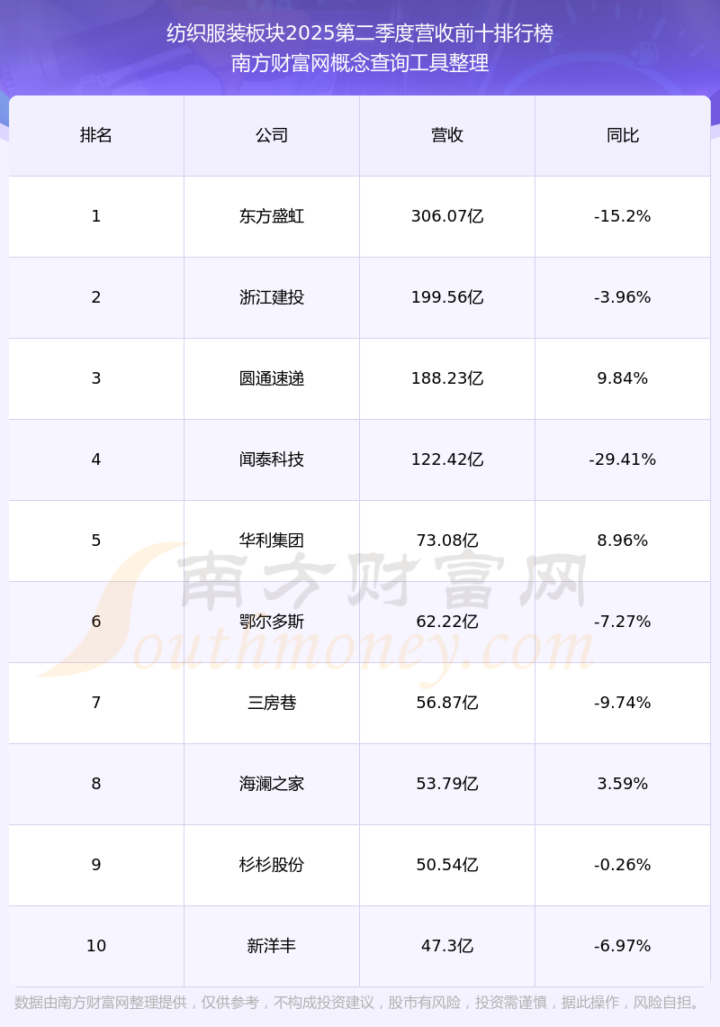 按照南方財富網(wǎng)概念查詢工具統(tǒng)計,該股所屬板塊為紡織服裝板塊,該板塊共有155只股票,天創(chuàng)時尚2025第二季度營收在該板塊中排名為第105名,該板塊2025第二季度營收排名前十的股票如下表: