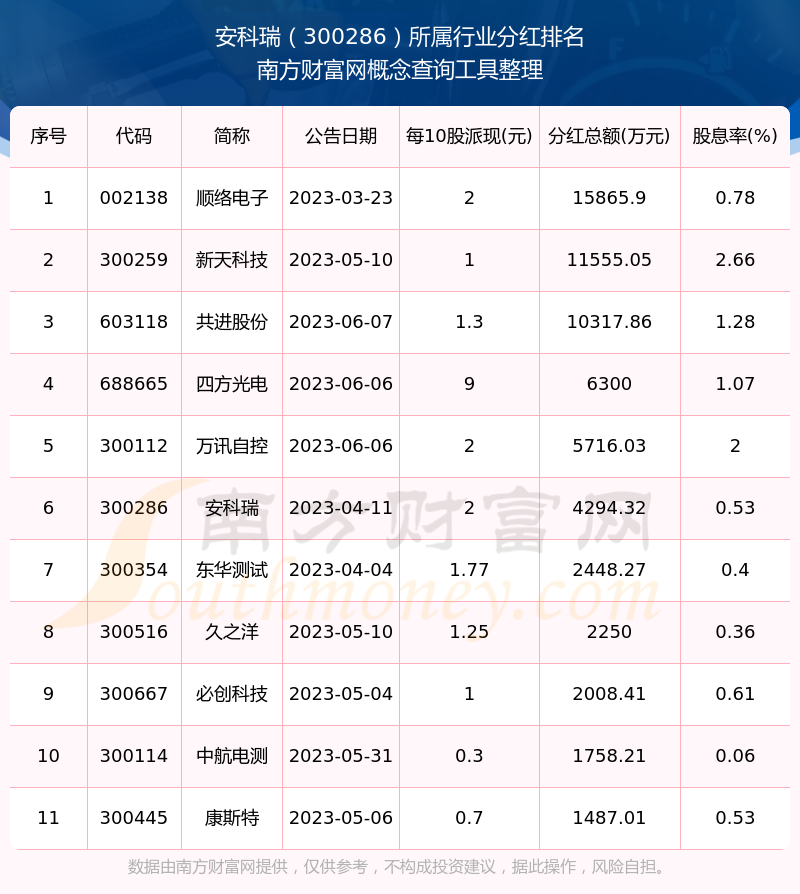按照南方財富網(wǎng)趨勢選股系統(tǒng)統(tǒng)計,安科瑞所屬行業(yè)為傳感器行業(yè),傳感器行業(yè)分紅排名情況如下表: