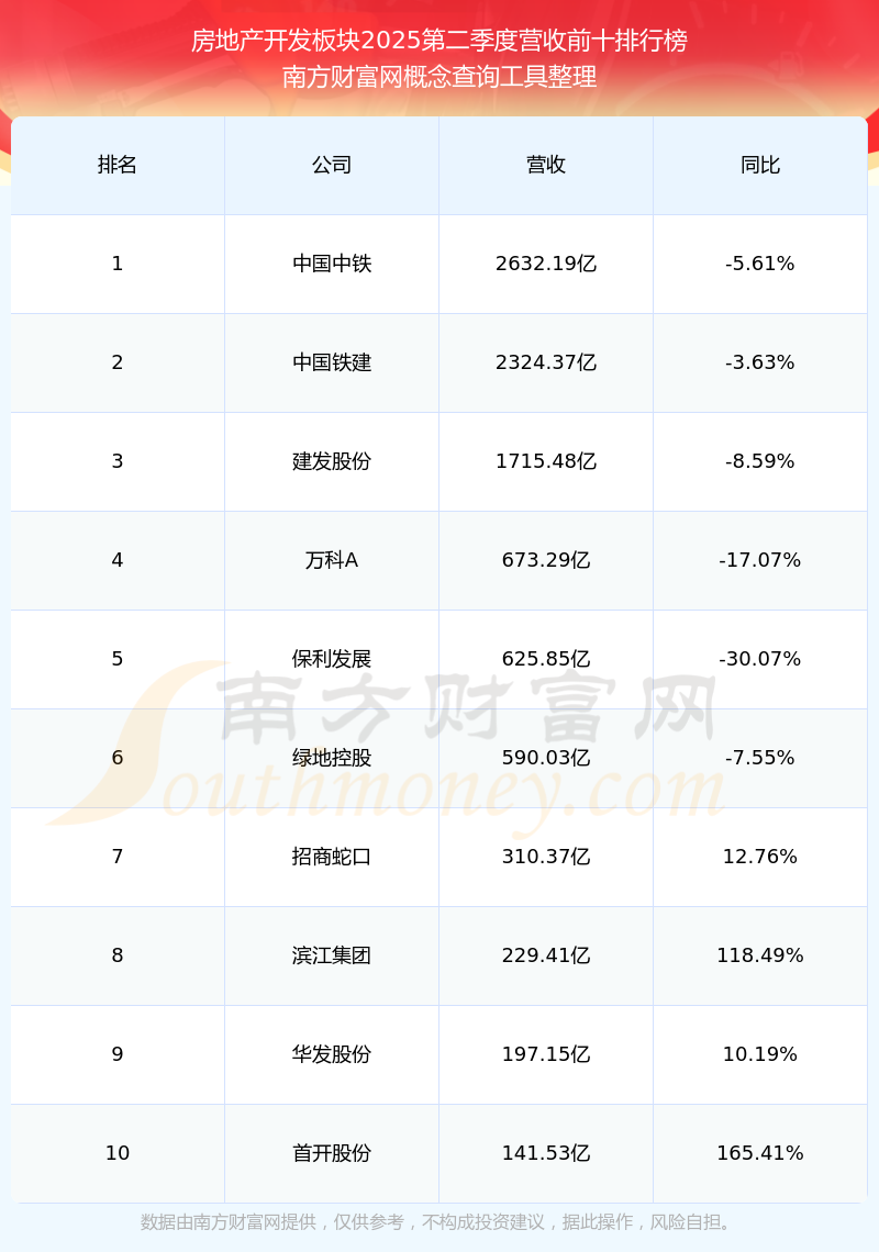 按照南方財富網(wǎng)概念查詢工具統(tǒng)計,該股所屬板塊為房地產(chǎn)開發(fā)板塊,該板塊共有143只股票,華發(fā)股份2025第二季度營收在該板塊中排名為第9名,該板塊2025第二季度營收排名前十的股票如下表: