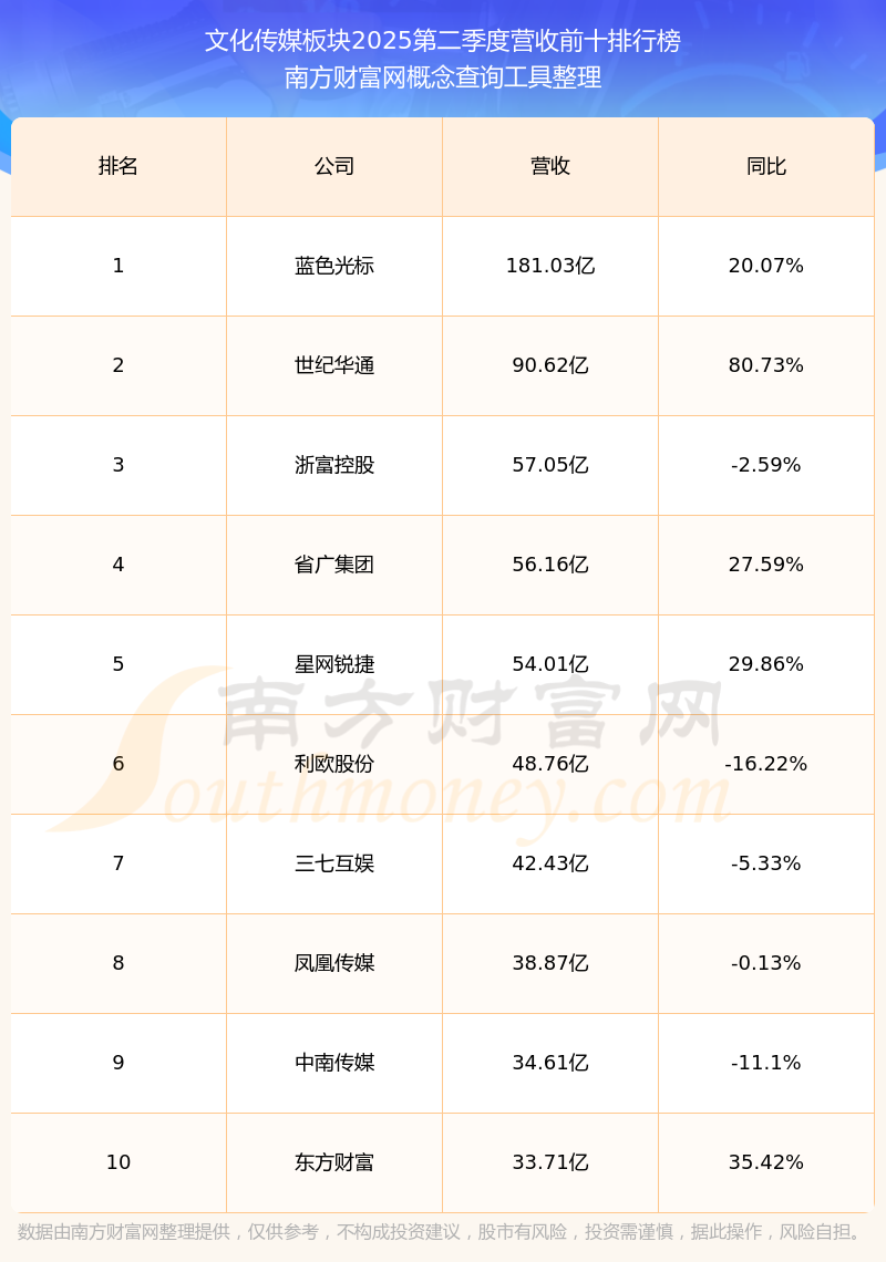 按照南方財(cái)富網(wǎng)概念查詢工具統(tǒng)計(jì),該股所屬板塊為文化傳媒板塊,該板塊共有240只股票,當(dāng)代明誠(chéng)2025第二季度營(yíng)收在該板塊中排名為第169名,該板塊2025第二季度營(yíng)收排名前十的股票如下表: