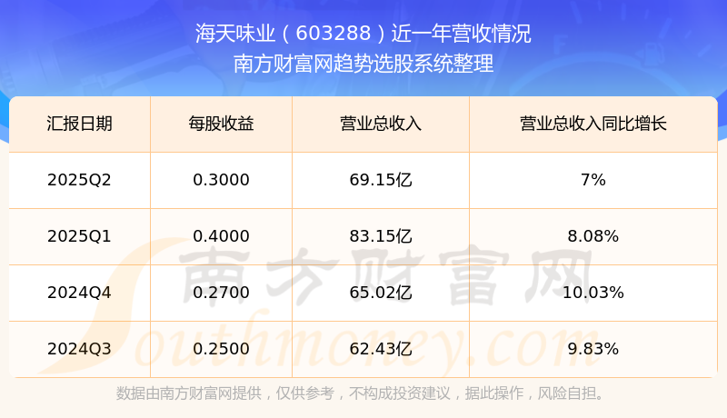 海天味業(yè)(603288)發(fā)布2025年第二季度財報。2025年第二季度海天味業(yè)實現營業(yè)收入69.15億元,同比增加7元%,環(huán)比增加-16.85%;凈利潤為17.12億元,同比增長11.57%,環(huán)比增長-22.28%。