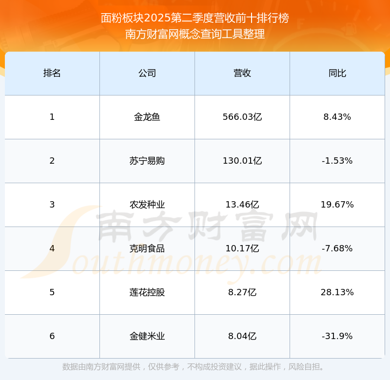 按照南方財(cái)富網(wǎng)概念查詢工具統(tǒng)計(jì),該股所屬板塊為面粉板塊,該板塊共有6只股票,華資實(shí)業(yè)2025第二季度營收在該板塊中排名為第6名,該板塊2025第二季度營收排名前十的股票如下表: