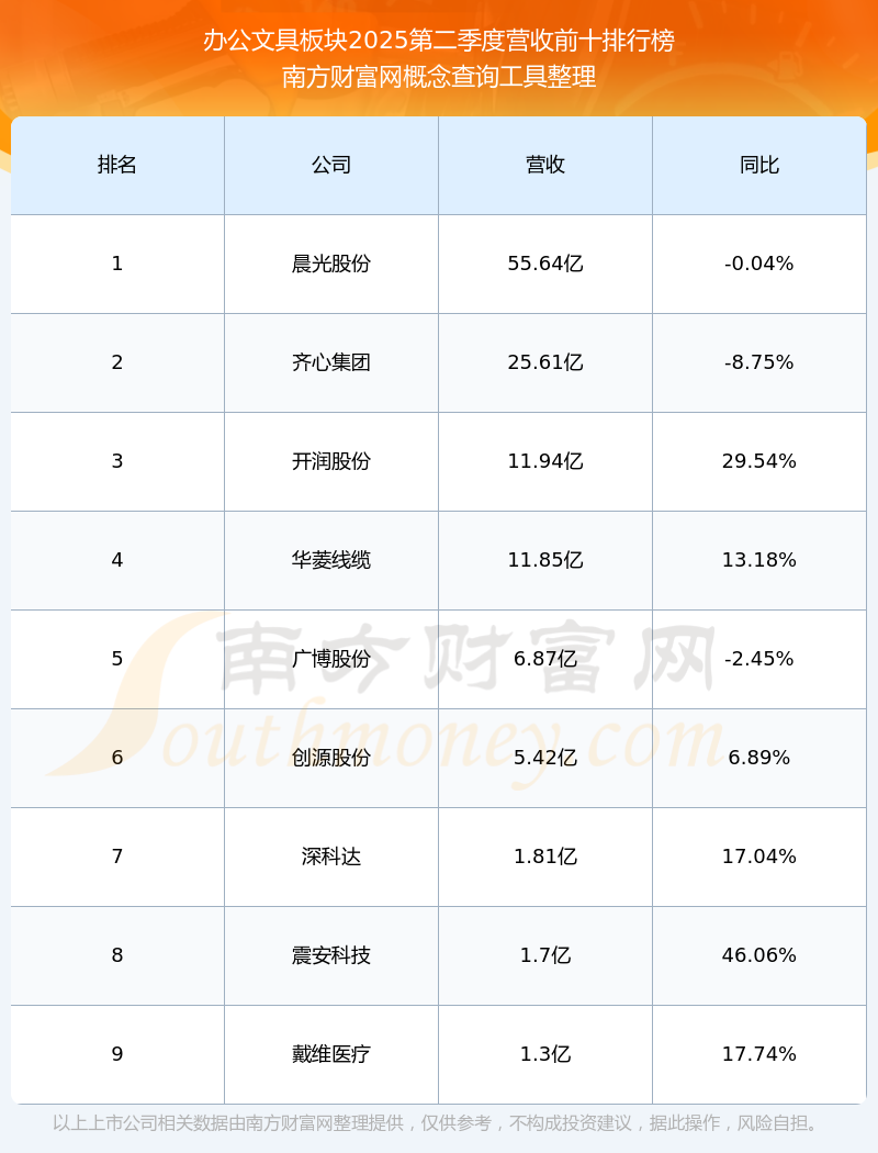 按照南方財(cái)富網(wǎng)概念查詢工具統(tǒng)計(jì),該股所屬板塊為辦公文具板塊,該板塊共有9只股票,晨光股份2025第二季度營收在該板塊中排名為第1名,該板塊2025第二季度營收排名前十的股票如下表: