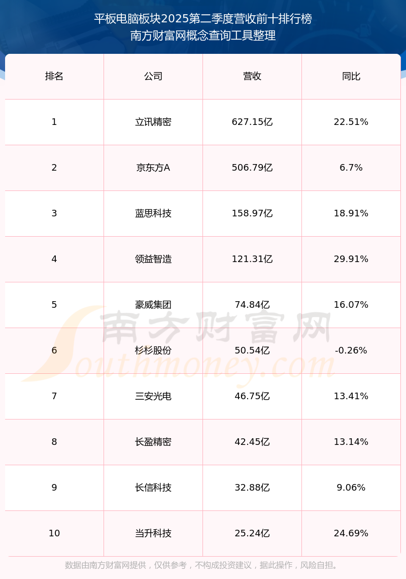 按照南方財富網(wǎng)概念查詢工具統(tǒng)計,該股所屬板塊為平板電腦板塊,該板塊共有47只股票,龍旗科技2025第二季度營收在該板塊中排名為第47名,該板塊2025第二季度營收排名前十的股票如下表: